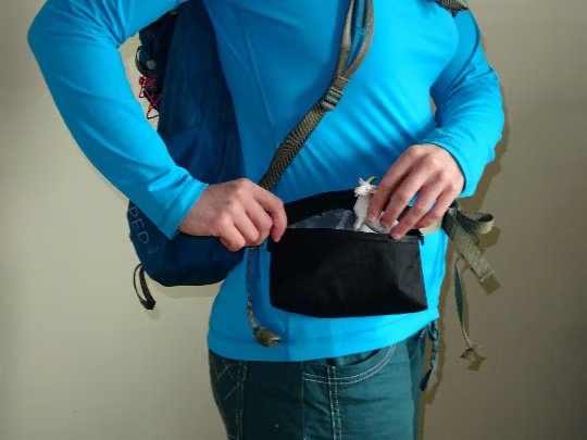 Essential easy access storage for day and long distance hikes. Fit most hip belts up to ~5.5 inch wide, although you can make the elastic longer if needed. It’s your project! Pocket dimensions 6 inch wide, 4 inch tall, 1.5 inch deep
