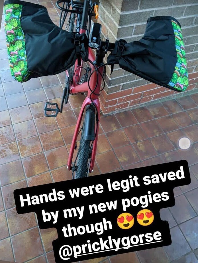 Large pogies designed for flat bar bicycle use. Untested on drop bars currently.