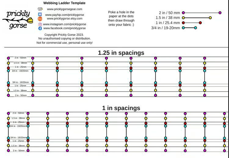 For perfectly spaced webbing ladders (MOLLE/PALS), these printable templates are a huge time-saver. Mark your fabric through the template holes for flawless alignment every time.