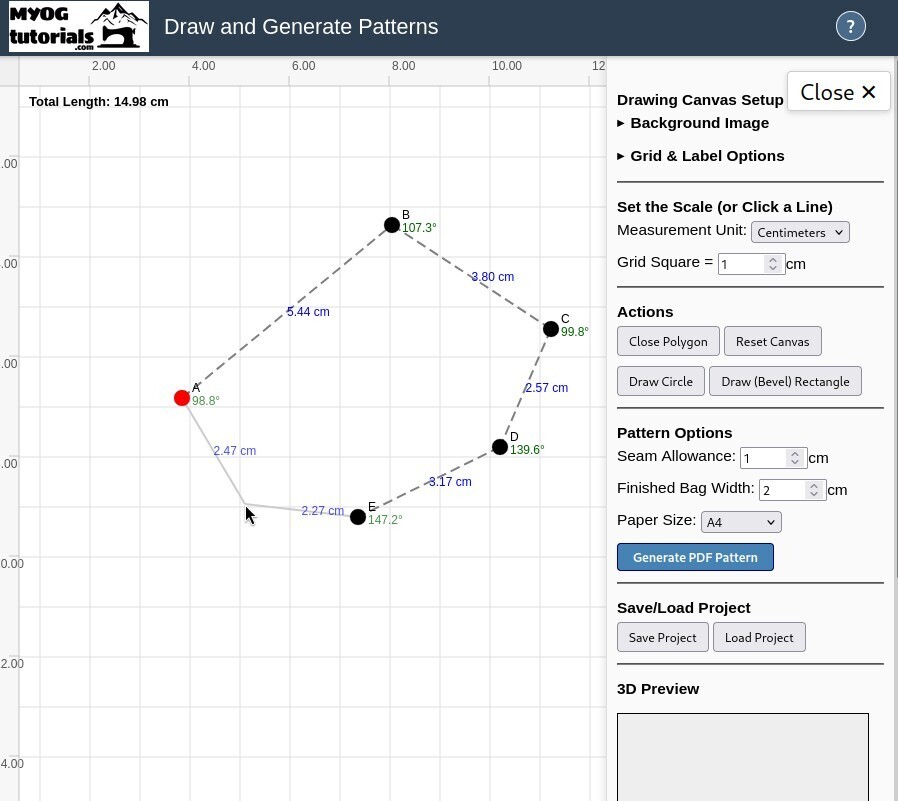 Add seam allowance by pressing Enter or clicking the "Close Polygon" button to complete the shape. A helpful 3D view will also appear! You can adjust the seam allowance in the pattern generation sidebar.