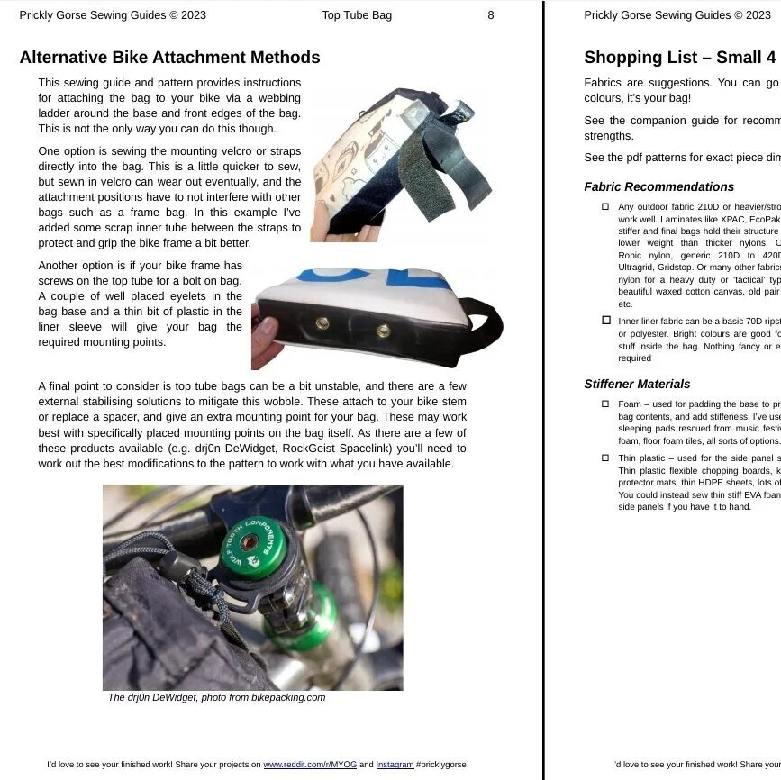 PDF guide and pattern for making your own top tube bag, and an additional complementary 25 page beginner sewing guide.