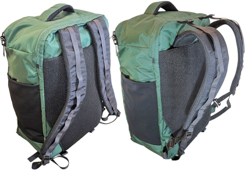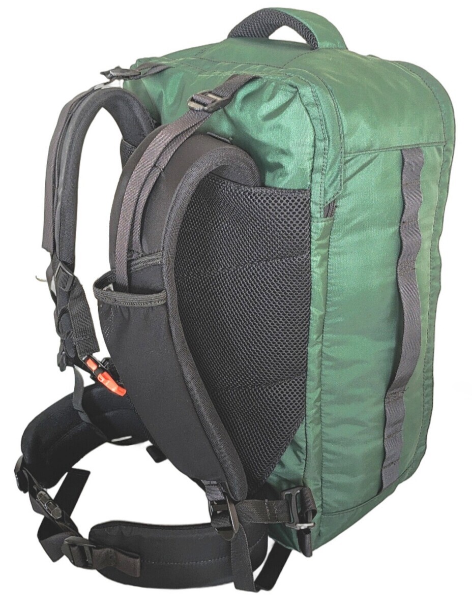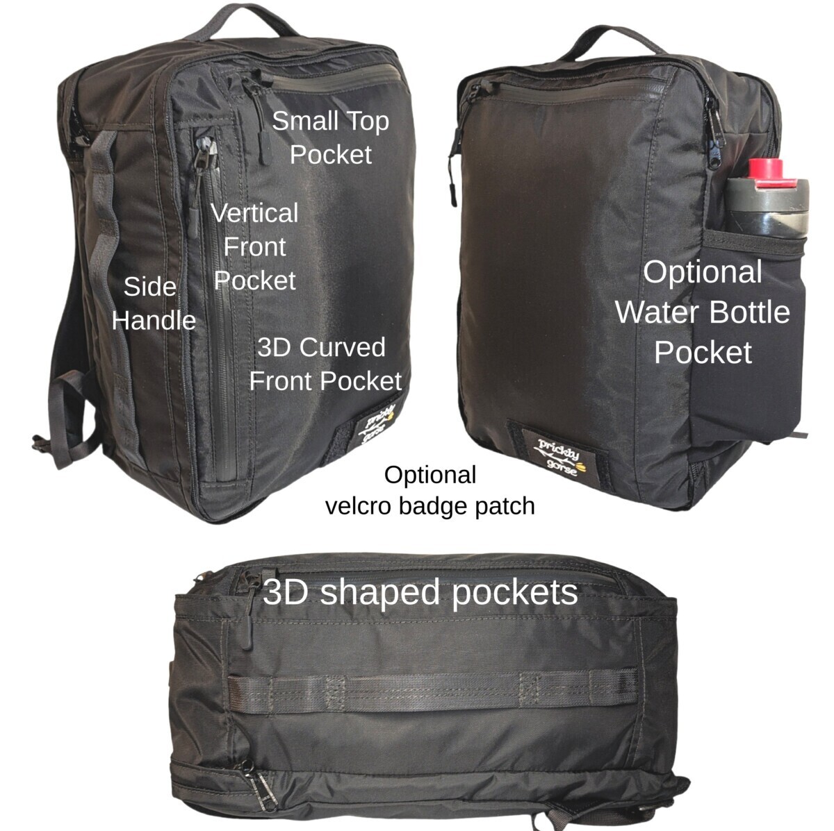 Ergonomically designed shoulder straps taken from my multi-day hiking backpack patterns, to ensure comfortable carry even after hours spent navigating busy terminals or exploring new cities. These can take an optional stretchy shoulder strap pocket, similar to that found on ultralight backpacks. Additional guidance is provided describing how to make them removable, if preferred.